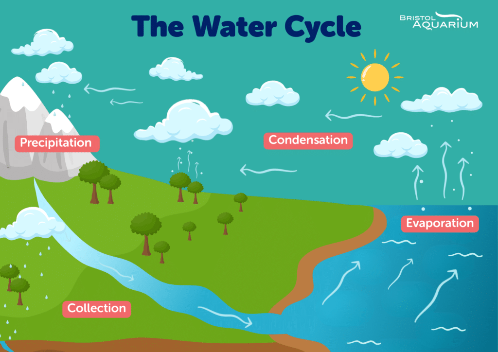 Once the water has fallen, it finds its way back home by collecting in our oceans, rivers, and lakes, or even soaking deep into the ground to fill underground reservoirs. From here, the journey is ready to begin all over again as the sun starts the evaporation process once more, keeping our planet’s water moving in a never-ending loop.