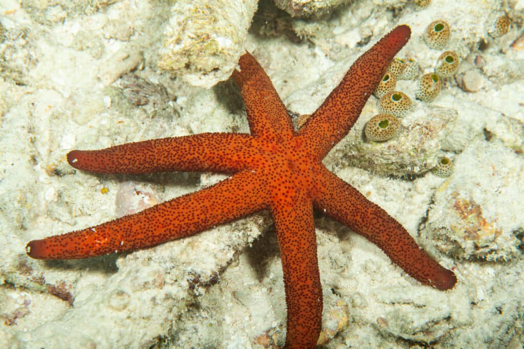 Starfish (Asteroidea) belong to the echinoderm family, which means they’re closely related to sand dollars and sea urchins. Approximately 2,000 species of starfish are known to be swimming around in seas around the world, including the common starfish (Asterias rubens), cushion starfish and blue sea star. Their habitats are varied depending on the species. Most live in tropical coral reefs and stay close to the seafloor. However, some prefer to live on rocky shores, seagrass and even cold seafloor habitats.