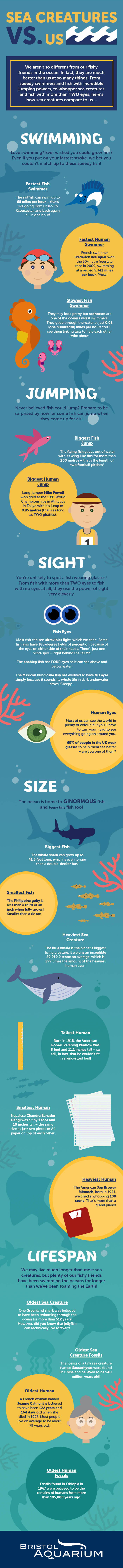So, come and take a plunge into the ocean and explore the creatures of the deep with us! From incredible jumpers and speedy swimmers, to fish with more than TWO eyes and fish of rather hefty size, here’s how we compare to the creatures in the big blue sea.