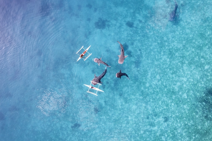 Although they don’t need to come up for air like their comparably sized whale counterparts, whale sharks are typically shallow water swimmers, so are easily spotted from fishing and tourist boats. They’re also naturally inquisitive and gentle, so can regularly be seen approaching boats – presumably in search of food.